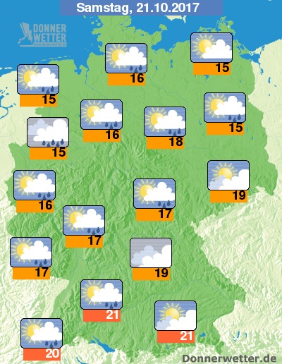 Am Samstag zieht ein Tiefausläufer vn West nach Ost über Deutschland hinweg, dazu fällt zeitweise Regen, abseits des Regens ist es aber auch oft locker bis aufgelockert bewölkt. Die Temperatur erreicht 15 Grad an den deutschen Küsten und etwa 21 Grad in München.