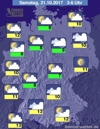 In der Nacht zum Samstag fällt im Norden bei oft starker Bewölkung hier und da Regen. Der Süden zeigt sich meist stark, hier und da auch mal aufgelockert bewölkt, dazu bleibt es trocken. Über der breiten Landesmitte ist der Himmel locker bewölkt, teils auch sternenklar und ebenso trocken. Die Temperatur sinkt auf 12 Grad an der Nordsee und bis 7 Grad im Thüringer Becken.