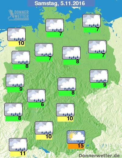 Am Samstag sind einzig im Südwesten einige Auflockerungen zu erwarten, dabei bleibt es hier auch weitgehend trocken. Im großen Rest der Republik hält sich dagegen dichte Bewölkung und es fällt immer wieder, teils auch langanhaltender Regen. Die Temperatur steigt verbreitet nur auf 6 bis 10 Grad, am Alpenrand sind jedoch nochmal bis zu 15 Grad C möglich.
