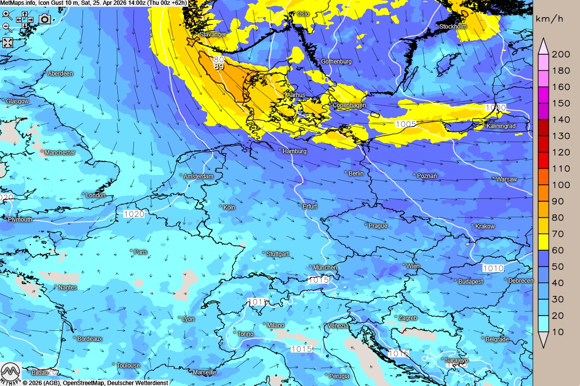 Der Samstag wird von einem kräftigen Temperatur- und Windgefälle geprägt: Im Norden und Nordosten sorgt ein Ausläufer eines Skandinavien-Tiefs für einen unbeständigeren Wettercharakter. Wechselnde Bewölkung dominiert das Bild, und örtlich ist mit leichtem Regen zu rechnen. Das Hauptthema im Norden ist jedoch der Wind: Ein stark auffrischender Nordwestwind bringt an den Küsten und im angrenzenden Binnenland stürmische Böen, was die gefühlten Temperaturen bei 11 bis 16 Grad deutlich drückt.