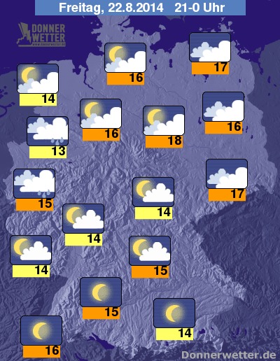 Heute Abend ziehen im Westen und Nordwesten vielfach dichte Wolken durch, dabei fällt zeitweise Regen oder es bilden sich einzelne Schauer, sonst ist es verbreitet aufgelockert bewölkt, im Süden vielfach klar und es bleibt trocken. Die Temperatur liegt noch bei 17 Grad an der Ostseeküste und etwas kühleren 13 Grad an der Lippe.