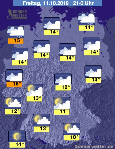 Bis zu den Frühstunden kühlt die Luft unter dem klarem Sternenhimmel Süddeutschlands auf 7 bis 11 Grad ab, am mildesten bleibt es im Breisgau mit 13 Grad. Milde Werte zwischen 11 und 14 Grad gibt es auch unter den dichteren Wolken im Norden, sowie in den Ballungsgebieten des Westens.