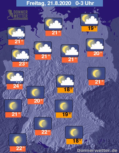 In der Nacht auf Freitag zeigt sich der Himmel über der Nordhälfte des Landes überwiegend locker bewölkt, zwischen Niederrhein und der Nordseeküste kann zeitweise auch mal ein Schauer fallen. Im Süden ist der Himmel zumeist sternenklar.