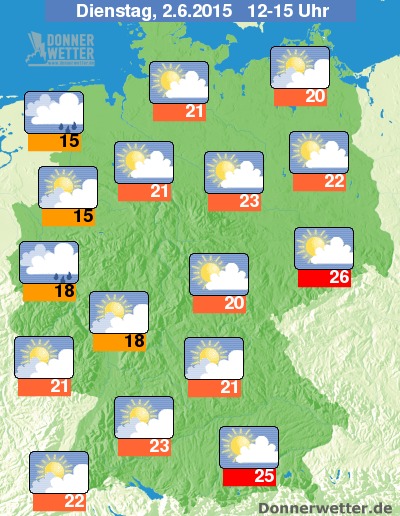 Am Dienstagmittag zeigt sich der Himmel über weiten Teilen des Landes heiter oder bewölkt, nur in der Westhälfte fallen noch örtliche Schauer. Die Temperaturen steigen auf Werte um 15 Grad C im Münsterland und bis 26 Grad C in der Sächsischen Schweiz.