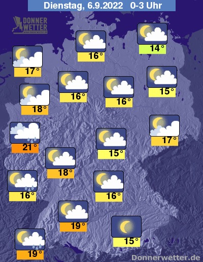 In der Nacht auf Dienstag überwiegt über weiten Landesteilen lockere oder aufgelockerte Bewölkung, am Alpenrand ist es auch sternenklar. Im äußersten Westen und Südwesten muss in der Nacht mit lokalen Schauern gerechnet werden, sonst bleibt es meist trocken.