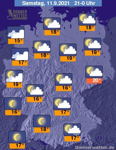 In den Abendstunden zeigt sich der Himmel über dem Norden und Osten anfangs noch meist wechselnd oder stark bewölkt, bevor es im weiteren Verlauf weiter auflockert. In der Südhälfte des Landes überwiegen lockere Wolken, im Südwesten klart es später auch auf. Im Osten und Südosten sind zunächst noch regionale Schauer möglich, bis Mitternacht klingen diese aber weitgehend ab. Ein geringes Schauerrisiko besteht dann nur noch am Alpenrand.