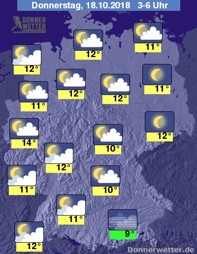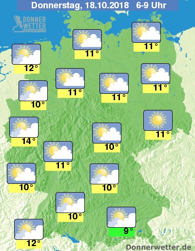 Die Frühtemperaturen liegen bei Werten um 9 Grad C in Oberbayern und um 14 Grad C in Köln.