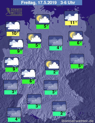 In der Nacht ist der Himmel über der West- und Nordwesthälfte meist bedeckt und immer wieder können Schauer fallen. In den übrigen Landesteilen bleibt es bei zunächst lockeren Wolken meist trocken; im weiteren Nachtverlauf kann sich vor allem in der Südhälfte verbreitet Nebel bilden.