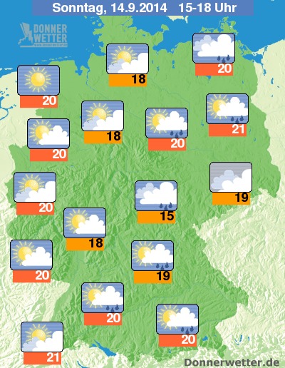 Heute Nachmittag bilden sich im Nordosten und Osten zeitweise Schauer, gebietsweise sind auch Gewitter möglich, im Süden ist es ebenfalls sehr unbeständig und es entwickeln sich einzelne Schauer. Bei lockerer bis aufgelockerter Bewölkung weitgehend trocken bleibt es beinahe ausnahmslos in der gesamten Westhälfte des Landes. Die Temperatur liegt bei 15 Grad im Coburger Land und bei schwülwarmen 21 Grad in Berlin.