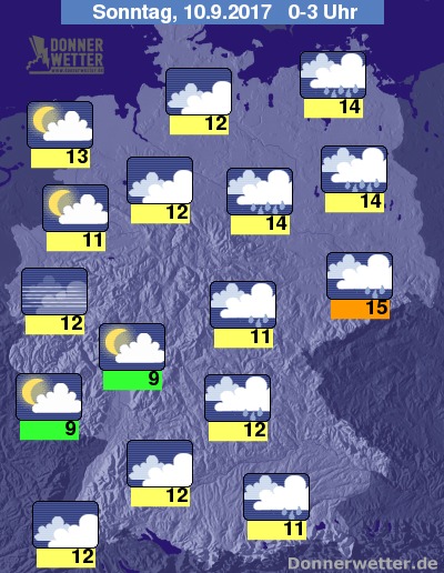 In der zweiten Nachthälfte lockern die Wolken zwischen Ostfriesland und dem Pfälzer Wald weiter auf, vereinzelt gelingt sogar mal ein Blick auf die Sterne. Regional kann sich Nebel bilden. In der Ost- und Südosthälfte setzen sich zum Teil kräftige Schauer zunächst fort, schwächen im weiteren Nachtverlauf aber allmählich ab.