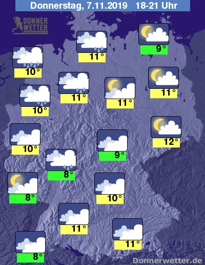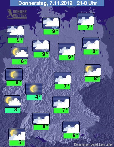 Am Abend regnet es vom Rhein-Main-Gebiet bis nach Schleswig-Holstein zunächst noch gelegentlich, sonst präsentiert sich der Himmel teils stark bewölkt, teils aufgeklart.