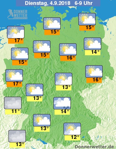 Die Temperaturen erreichen am Morgen Werte um 11 bis 14 Grad C in der Südhälfte und um 17 Grad C in Ostfriesland.