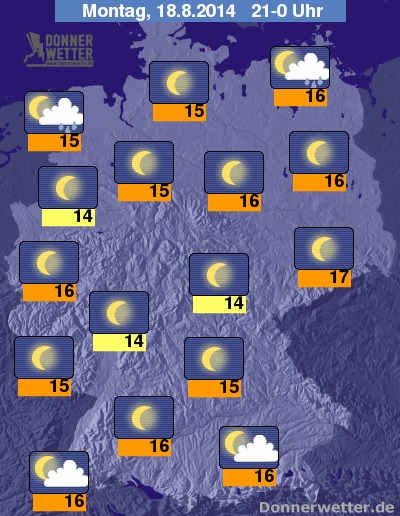 Heute Abend bilden sich an den Küsten und gebietsweise am Alpenrand noch einzelne Schauer und kurze Gewitter, ansosnten klart der Himmel jedoch verbreitet auf und die Sterne zeigen sich. Die Abendtemperaturen liegen bei 17 Grad in der Niederlausitz und 14 Grad an der Rhön.