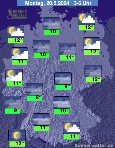 In der Nacht auf Montag sind im äußersten Westen und Nordwesten anfangs noch einzelne Schauer möglich, in den übrigen Landesteilen bleibt es bei sternenklarem Himmel oder nur geringer Bewölkung überwiegend trocken. Verbreitet kann sich in den frühen Morgenstunden Nebel bilden.