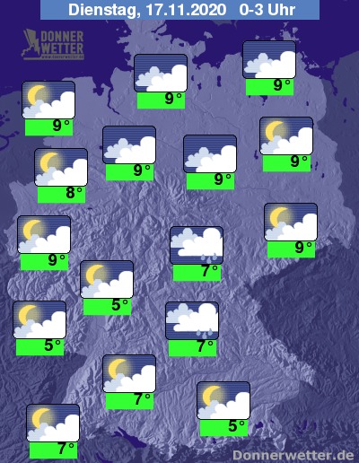 In der Nacht auf Dienstag bleibt die Wolkendecke an Weser und Elbe sowie im Südosten Detuschlands zunächst noch geschlossen, bevor in den frühen Morgenstunden wie in den übrigen Landesteilen ein Mix aus lockerer oder aufgelockerter Bewölkung überwiegt. Im Südosten kann es dabei zunächst noch vereinzelt tröpfeln, sonst bleibt es häufig trocken.