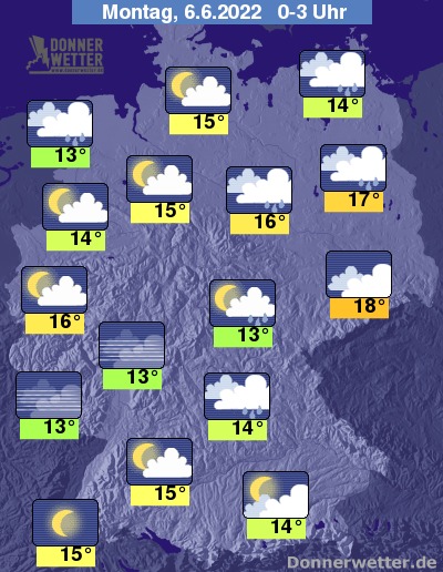 Die Temperaturen erreichen zunächst Werte um 12 Grad im Nordwesten, 15 Grad am Oberrhein und 21 Grad im nördlichen Sachsen.