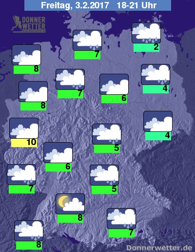 Bereits jetzt hat sich das Regenband über weite Teile der Bundesrepublik ausgebreitet. Wo es zwischen Küsten und Alpen nicht regnet, bedecken dichte Wolken den Himmel. Dabei liegen die Höchstwerte am Nachmittag zwischen 2 Grad an der Ostsee und 10 Grad am Niederrhein.