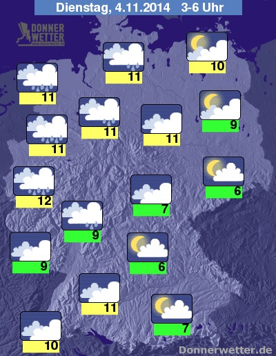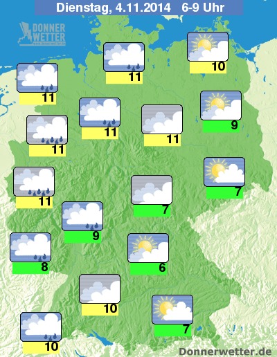 Am freundlichsten zeigt sich der Dienstagmorgen zunächst noch im Osten und Südosten Deutschlands. Die Temperaturen am Morgen liegen bei Werten um 6 bis 11 Grad C.