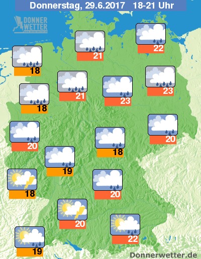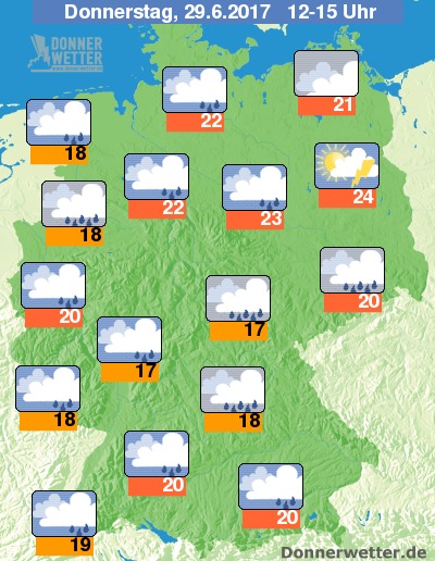 Bis zum Abend verlagern sich die dunkelsten Regenwolken in den Norden und regnen sich dort fast ohne Unterbrechung ab. Entlang des Rheins und im Süden kommt hingegen für kurze Zeit sogar die Sonne zum Vorschein, jedoch trüben einzelne Gewitter und kräftige Schauer das Bild.