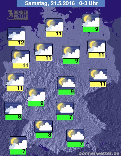 In der zweiten Nachthälfte bleibt es in der Nordhälfte Deutschlands bei teils dichter, teils aufgelockerter Bewölkung. Im Süden dominieren lockere Wolkenfelder.