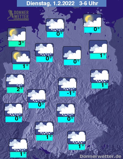 In der Nacht zum Dienstag bleibt der Himmel weitgehend bedeckt, lediglich im Nordwesten und in Vorpommern zeigen sich häufiger Auflockerungen, hier und auch im übrigen Norden bleibt es bis auf wenige Ausnahmen auch trocken. Im übrigen Land fällt zeitweise, im Süden häufig Schnee, zum Teil auch Schneeregen oder Regen. Die Temperatur sinkt auf 3 Grad an der Nordsee und bis -1 Grad im Vogtland. Der Wind nimmt spürbar ab, weht aber vor allem an den Küsten noch meist stark.