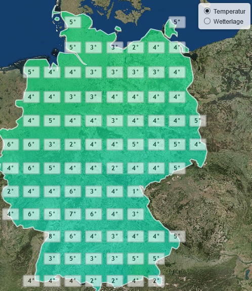 Bei teils kräftigen Winden steigen die Höchstwerte am Nachmittag vor allem in den Tallagen zwischen Erzgebirge und Bayerischem Wald nur knapp über den Gefrierpunkt. In Nordbaden sind hingegen bis zu 8 Grad möglich.