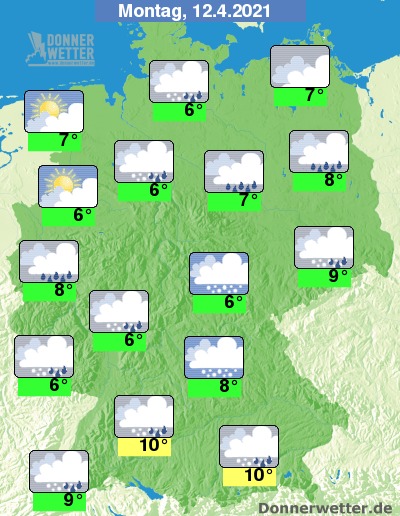 Am Montag bleibt es über der Südosthälfte Deutschland bedeckt und hier fällt zeitweise Regen, Schneeregen oder Schnee. Weiter nach Nordwesten hin fallen nur noch selten Niederschläge und es kann gebietsweise auch auflockern. Die Temperatur erreicht 6 Grad in Hamburg und etwa 10 Grad in München.