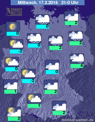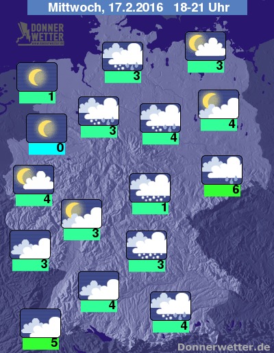 Am Abendeinbruch ziehen Wolken über den mittleren Teil des Nordens, die das Risiko auf Schneeregen am Mittwoch Abend erhöhen. Am Münsterland und an der Nordseeküste kann man den Sonnenuntergang durch einen klaren Himmel gut beobachten. In den Bundesländern Thüringen und Bayern ist ebenfalls Schneefall mit wechselhaften Schneeregen angesagt.