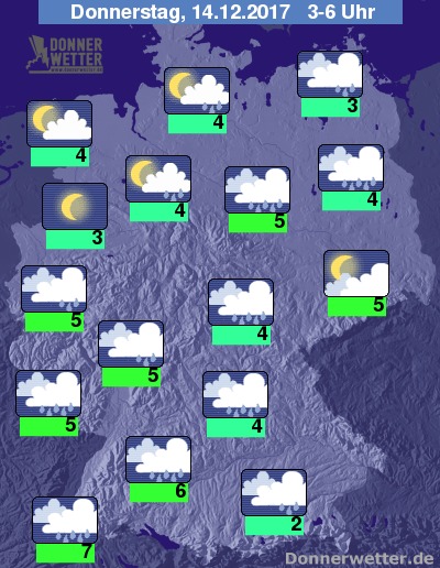 In der Nacht zum Donnerstag bleibt es zum Großteil bei dichten Wolken, die häufig Regen, teils auch Schneeregen bringen. Im weiteren Verlauf lockert und klart der Himmel im Nordwesten und Westen auf, dazu bleibt es hier dann trocken. Die Tiefstwerte liegen bei 7 bis 3 Grad.