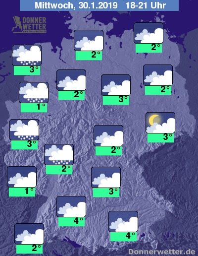 In den Abendstunden bleibt der Himmel überwiegend stark bewölkt oder bedeckt, Auflockerungen sind vor allem im südlichen Sachsen sowie später auch im Südwesten Deutschlands zu erwarten. Zwischen Ostfriesland und dem Taunus fallen am Abend weiterhin örtliche Schneeregen- oder Schneeschauer, in den übrigen Landesteilen bleibt es meist trocken.
