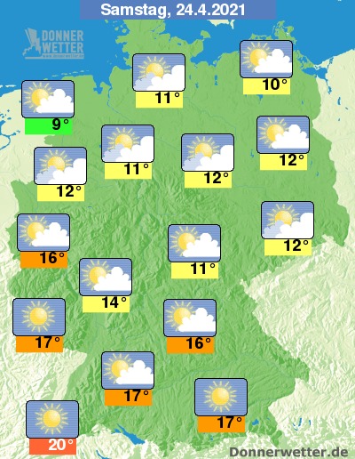Am Samstag ist es im Süden und Norden zumeist heiter oder sonnig. Im übrigen Land ziehen oft viele und teils auch dichte Wolken durch, gebietsweise zeigen sich aber auch Aufheiterungen. Es bleibt landesweit trocken bei 9 Grad in Cuxhaven und bis zu 20 Grad in Freiburg.
