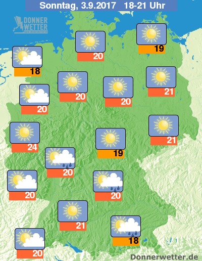 Heute Abend ist es fast landesweit nur heiter bis sonnig, nur selten ziehen auch mal dichtere Wolken mit etwas Regen durch, sonst bleibt es trocken bei Temperaturen von 18 Grad in Cuxhaven und bis 24 Grad in Köln.