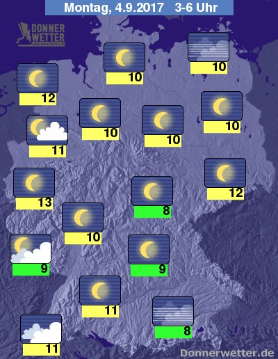 In der Nacht zum Montag zeigt sich der Himmel über der Bundesrepublik vor allem entlang des Rheins gebietsweise locker bewölkt, sonst ist es jedoch überwiegend sternenklar, dazu bleibt es trocken. Die Temperatur sinkt auf 13 Grad in Bonn und bis 8 Grad in Rosenheim.