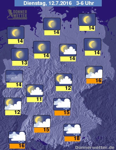 In der Nacht zum Dienstag zeigt sich der Himmel über Süddeutschland meist bedeckt und es bilden sich gebietsweise Schauer, selten auch Gewitter. Über der Nordhälfte Deutschlands ist es dagegen verbreitet sternenklar und dazu trocken. In den übrigen Landesteilen ist es teils locker, teils aufgelockert bewölkt und trocken. Die Temperatur sinkt auf 18 Grad in München und etwa 11 Grad am Westerwald.