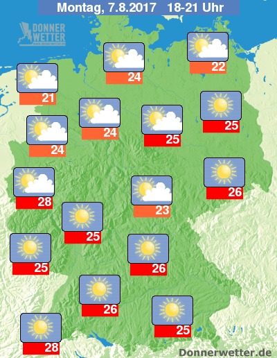 Heute Abend bleibt es über der Südhälfte des Landes sowie in den östlichen Landesteilen weitgehend sonnig, sonst ist es oft gering bis locker bewölkt, dabei bleibt es bundesweit trocken. Die Temperatur liegt bei etwa 21 Grad in Emden und bis 28 Grad im Breisgau.