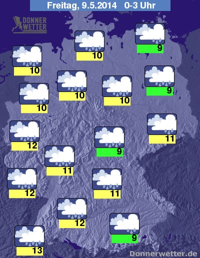Differenziert werden kann allein 'starker' und 'nicht so starker' Regen. Letztere fallen in der Nacht im Südosten Deutschlands.