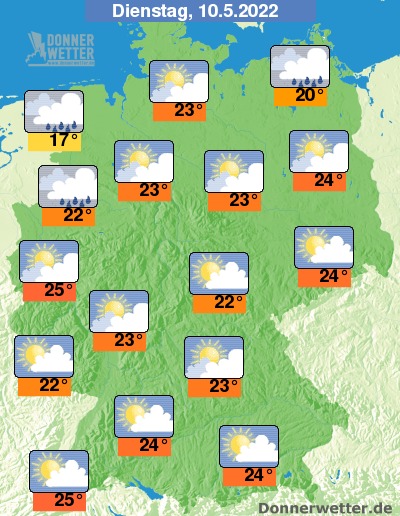 Heute ist es vor allem im Süden meist heiter bis sonnig. Im übrigen Land ist es aufgelockert bewölkt, von Nordwesten ziehen jedoch zunehmend dichte Wolken heran, dazu bilden sich im Norden örtliche Schauer, während es sonst trocken bleibt. Die Temperatur steigt auf 17 Grad in Bremerhaven und bis 25 Grad in Freiburg.