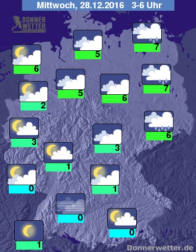 In der Nacht zum Mittwoch zeigt sich die Nordosthälfte Deutschlands überwiegend bedeckt, Regen fällt dabei zeitweise vom Nordosten, über den Osten bis in den äußeren Südosten Deutschlands, sonst ist es mehrheitlich trocken. Deutlich freundlicher bei meist nur lockeren Wolken oder klarem Himmel ist es über dem Süden, Südwesten und Westen des Landes, hier bleibt es trocken. Die Temperatur sinkt auf 7 Grad in Berlin und bis etwa 0 Grad im Kraichgau.