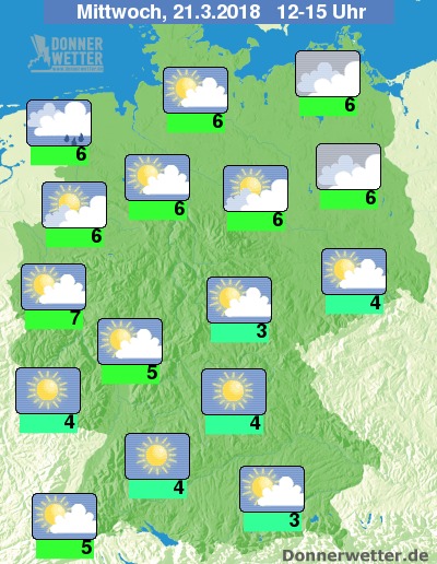 Heute Nachmittag ziehen dichte Wolken mit Regen über den Norden Deutschlands hinweg, dazwischen kann es auch mal auflockern. Im Süden scheint die Sonne bei wolkenlosem oder nur locker bewölktem Himmel, sonst ist es meist aufgelockert bewölkt, dabei bleibt es trocken. Die Temperatur liegt bei 3 bis 7 Grad.