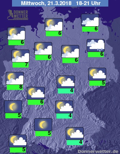 Heute Abend bringen dichte Wolken im Osten und Nordosten gebietsweise Regen, sonst ist es über der Nordhälfte häufig stark, teils aufgelockert bewölkt und dabei überwiegend trocken. Im Süden ist es nur locker bewölkt oder klar und dazu trocken. Die Temperatur liegt zwischen 4 Grad in Mittelfranken und 8 Grad im Rheinland.