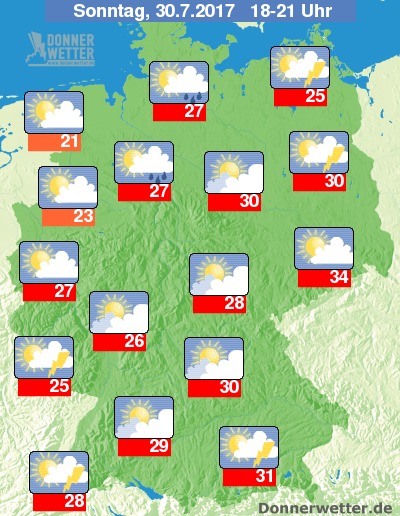 Heute Abend ziehen oft viele und auch nicht selten dichte Quellwolken durch, die hier und da für Schauer und örtlich auch kräftige Gewitter sorgen. Überwiegend trocken bleibt es von NRW bis ins westliche Niedersachsen und auch von Sachsen bis nach Bayern. Die Temperatur liegt bei 21 Grad in Emden und bis 34 Grad in Dresden.