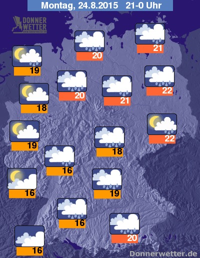 Am Abend ziehen fast überwiegend über ganz Deutschland Regenwolken her. Dadurch ist mit unterschiedlich kurzen und langen Schauern zu rechnen. Nur die Regionen Berlin und Sachsen sind vom Regen verschohnt, dort scheint am Abend teilweise die Sonne, sonst ist auch dort der Himmel teils von Wolken bedeckt.
