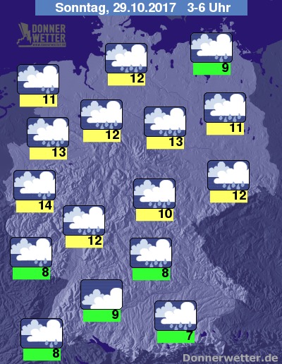 In der Nacht zum Sonntag bleibt der Himmel wolkenverhangen und es fällt verbreitet kräftiger und oft langanhaltender Regen. Dazu weht der Wind meist frisch bis stark, über der Nordhälfte stürmisch, auf den Bergen und an den Küsten auch orkanartig, dabei sind Orkanböen möglich. Die Temperatur sinkt auf 14 bis 7 Grad.
