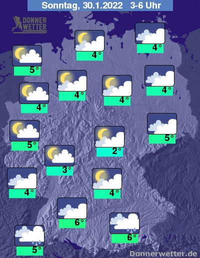 In der folgenden Nacht fällt im Süden zunächst noch weiterhin gebietsweise Regen, der zum Morgen hin abklingt. Im übrigen Bundesgebiet ist es teils aufgelockert, teils stark bewölkt und es bleibt weitgehend trocken. Die Temperatur sinkt auf 6 Grad in Stuttgart und bis 2 Grad in Jena. An den Küsten herrscht vielerorts schwerer Sturm mit orkanartigen Böen. Über der Nordwesthälfte ist es meist stürmisch mit Sturmböen, im übrigen Land ist es teils stürmisch.