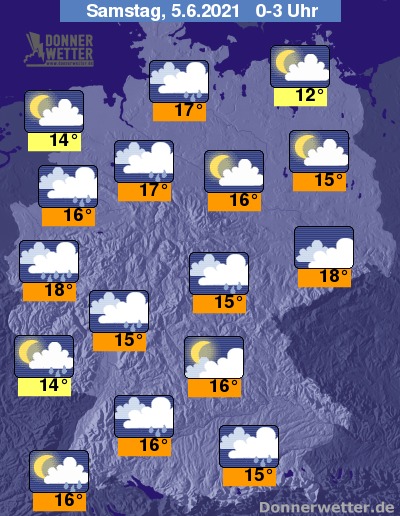 In der Nacht auf Samstag bleibt der Himmel verbreitet wechselnd oder stark bewölkt, lockere Wolken halten sich in den nächsten Stunden vor allem an den Küsten, im Nordosten sowie der Landesmitte. Hier bleiben die Nachtstunden dann auch weitgehend niederschlagsfrei, südlich der Donau und in der Westhälfte muss dagegen verbreitet mit Schauern und einzelnen Gewittern gerechnet werden.