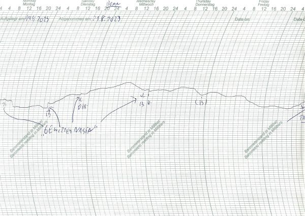 Der Luftdruckschrieb zeigt sogenannte "Gewitternasen", die unser Schreiber letzte Woche Montag und Dienstag aufgezeichnet hat. Zu Beginn dieser Woche bestehen keine nennenswerten Gewitterrisiken, somit bleibt die aktuelle Aufzeichnung wohl "nasenfrei".