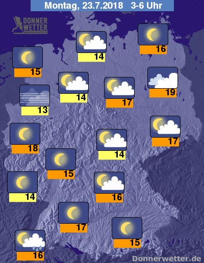 In der Nacht zum Montag sind über dem Süden anfangs noch Schauer und örtliche Gewitter möglich, sie klingen etwa ab Mitternacht ab und anschließend lockert und klart der Himmel auf. Im übrigen Land ist es zunächst teils wechselnd, teils locker bewölkt, der Himmel klart jedoch über weiten Landesteilen auf, dazu bleibt es trocken. Die Temperatur sinkt auf 19 Grad in Berlin und bis 13 Grad am Niederrhein.