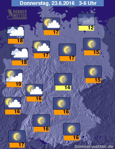 In der Nacht zum Donnerstag ist der Himmel über dem Land zunächst verbreitet sternenklar, dazu natürlich auch trocken. Im Nachtverlauf ziehen jedoch einige und zum Teil auch dichte Wolken in die westlichen Landesteile, dabei ist über der Westhälfte Niedersachsens, sowie im Norden von NRW zeitweiliger Regen möglich. Im übrigen Bundesgebiet bleibt es trocken. Die Temperatur sinkt auf 19 Grad in Köln und bis etwa 12 Grad an der Müritz.