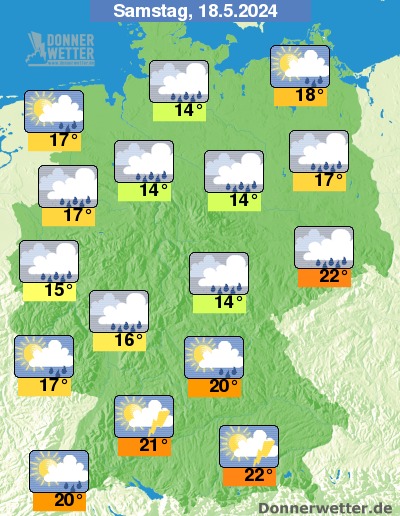 Am Samstag zeigt sich der Himmel über weiten Teilen des Landes wechselnd oder stark bewölkt, dabei muss verbreitet Schauern und lokalen Gewittern gerechnet werden. Längere trockene und freundliche Phasen sind am Samstag am ehesten im Umfeld der Küsten sowie im Süden und Südosten zu erwarten.