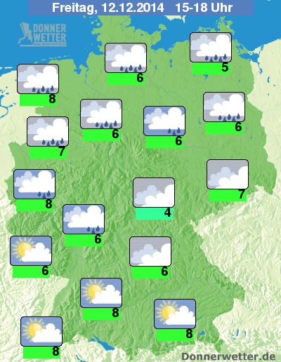 Heute Nachmittag ziehen überwiegend dichte Wolken durch und es herrscht nasskaltes und sehr windiges Wetter mit zum Teil kräftigen Regengüssen. Im Süden Deutschlands kann es dagegen auch häufig auflockern, hier bleibt es weitgehend trocken. Der Wind weht meist frisch bis stark und in Böen stürmisch, auf den Bergen und an der See ist es zumeist stürmisch und in Böen weht der Wind orkanartig, dabei sind auch Orkanböen möglich. Die Temperatur liegt bei 4 Grad am Elstergebirge und etwa 8 Grad in Köln.